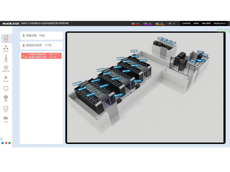 近期有幸為江蘇省某市檢察院提供三套安德力士品牌微模塊機房設(shè)備,涉及系統(tǒng)有:UPS不間斷電源、精密空調(diào)、機柜、配電、動力環(huán)境監(jiān)控等系統(tǒng);涉及主要設(shè)備有:UPS主機(30KVA、40KVA、300KVA)、鉛酸蓄電池(100AH64節(jié)、200AH128節(jié)、250AH320節(jié))、精密空調(diào)(行級25KW12臺、基站12.5KW4臺)、機柜51套,現(xiàn)已全部安裝調(diào)試完成。